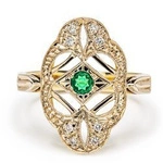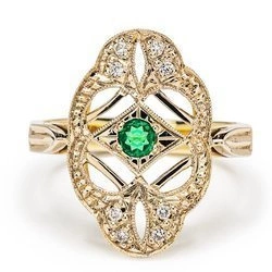 Unikatowy złoty pierścionek Art Deco z brylantami 0,07 ct i naturalnym Szmaragdem